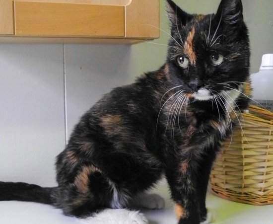 Veldig sliten og mager. Det er merker etter halsbånd rundt halsen, men det er ikke der lenger. Hun har ikke chip/id-merke. Mørk skilpaddefarget pels med hvite poter, litt hvit på brystet og litt på haka.