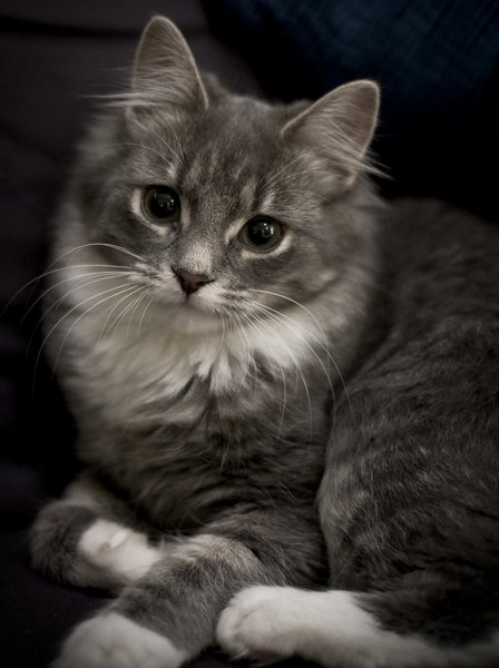Litt tigerstripet i ansiktet, hvite sokker og hvit på magen. Grå ellers.