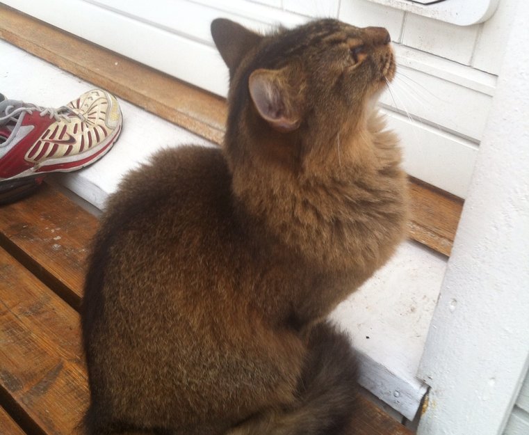Den har flyttet inn på treassen og vil hele tiden komme inn, åpenbart vant med kattedør. Er veldig tam og kosete.