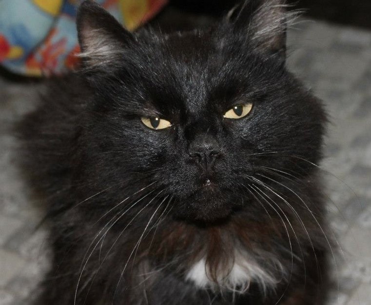 Hvit flekk på halsen. Litt gråhåret på hodet. Hvite "tuster" i ørene. Også brunt i pelsen. Veldig tuggete og virker ha gått ute en stund. Overkosete og tillitsfull. Anslått av dyrlege til å være 2-3 år.