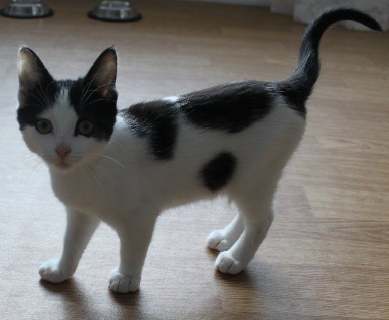 Er litt større enn på bildet, ca 6mnd. Er nylig sterilisert, så har et godt synlig arr/sår på magen. Hun har hvit kropp med sorte flekker på rygg og side, sort hale, sort rundt ett øye og på hodet.