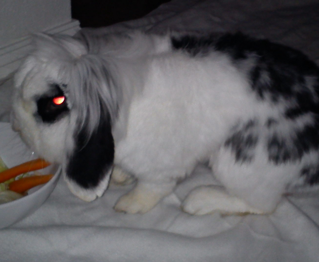 Hvit med sorte flekker. Den liker gulrøtter og ferdigsalat.