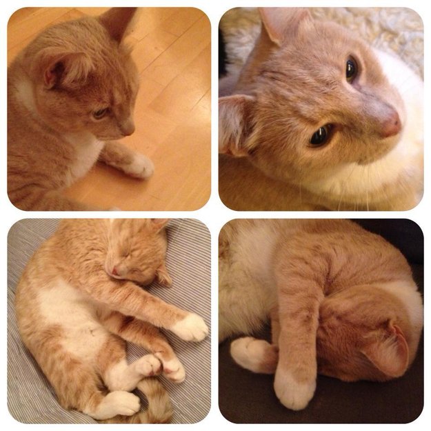 Gabriel er hvit og kaffelatte/lysebrun/rødbrun - stripete pels - tigerstripete.