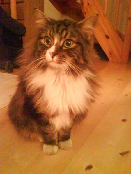 Katten er ganske stor og har idag ganske flokete pels. Har hvitt bryst og hvite poter. Lys på magen. Ellers tigerstripet. Veldig snill og tåler det meste. Har noen tall i øret, men det er vanskelig å lese dem av. Tror -kanskje- de 4 siste tallene er 0250.