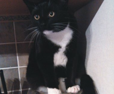 Ung katt ca. 1 år, litt fat ca. 7kg. Svart med hvit magen, "sokker" og hake. Hann har mikrochip og hann er kastrert