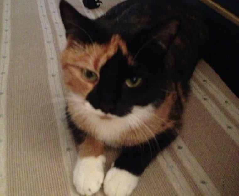 Sort, gyllenbrun og hvit hunnkatt forsvant utenfor dyrlegen på Sundre Torg, løp opp i Bergstien og jeg så henne 99% sikkert i går kveld, men hun er redd og sky. Tidligere hjemløs, men trygg og kjærlig mot kjente nå, veldig glad i våtfor. Felle er satt ut, plakater hengt opp, men hun er redd nå og trenger nok å lokkes/lures. Dersom noen har sett henne vær snill og ring meg på 91755229 . Hun er høyt elsket og desperat savnet..