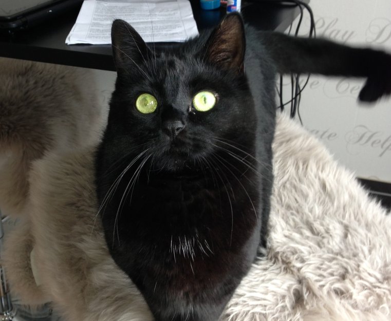 Tassen er veldig glad i mennesker. Hun er mere stor enn liten, og har noen få hvite hår på halsen. Hun har også en liten knute i pelsen på ryggen. Hun er chippet.