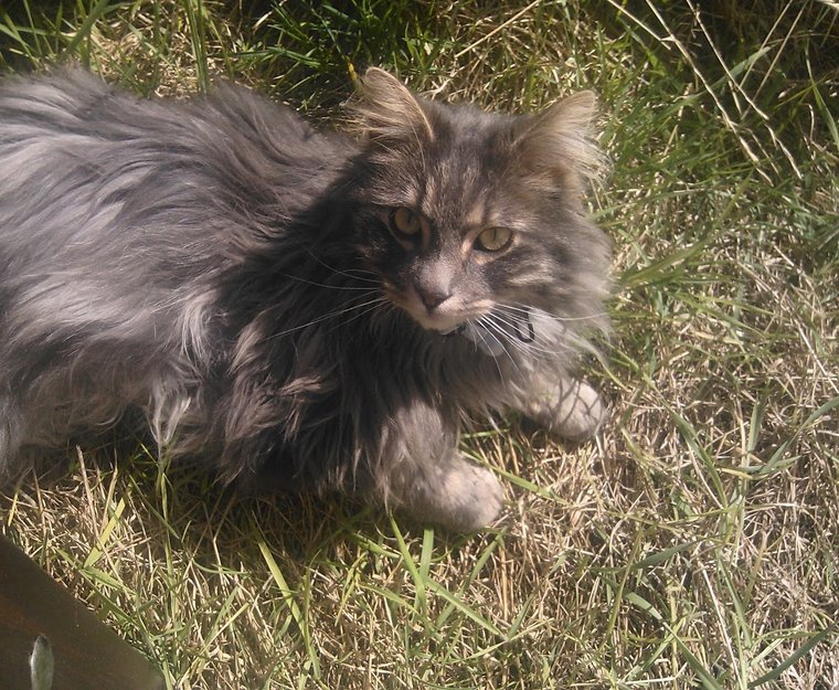 Gråspraglete med langt hår. Hadde på seg grått reflekshalsbånd med tlfnr på. Er ID-merket, men har ikke ID-tatovering.