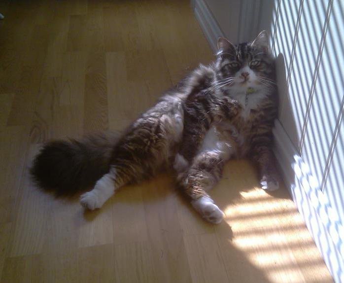Klumpen kom aldri inn igjen fra luftetur den 25. mai. Han er veldig selskapsjuk, kjælen og matglad, og han går aldri langt hjemmefra, han er aldri borte mer enn noen timer. Vi har lett høyt og lavt i nærmiljøet uten hell. Han er veldig redd biler, så jeg tror ikke han er påkjørt.. Han kan ha blitt skremt og løpt seg bort, være innestengt et sted..Vi savner han veldig!