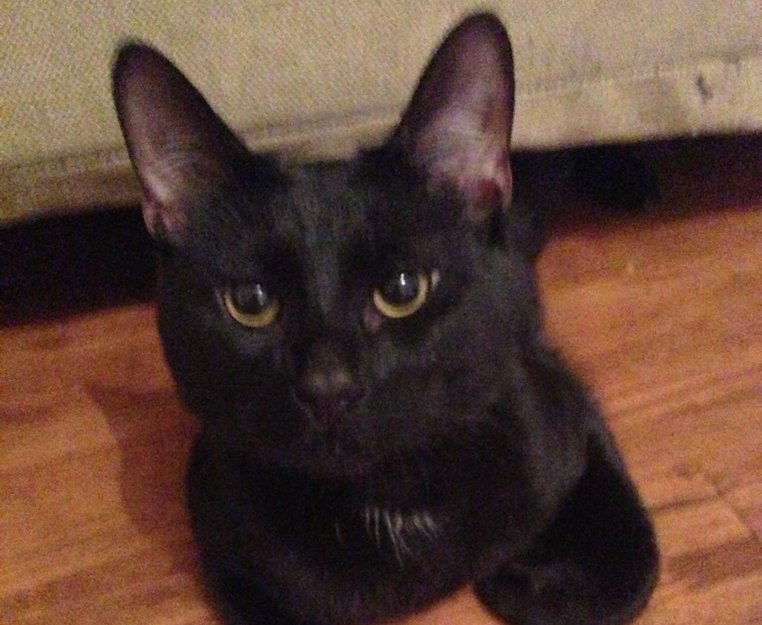 Putte"hilser" med å løfte labben. Har en liten hvit medaljong på brystet. Han er bare 10 mnd gammel. Han er merket med chip.