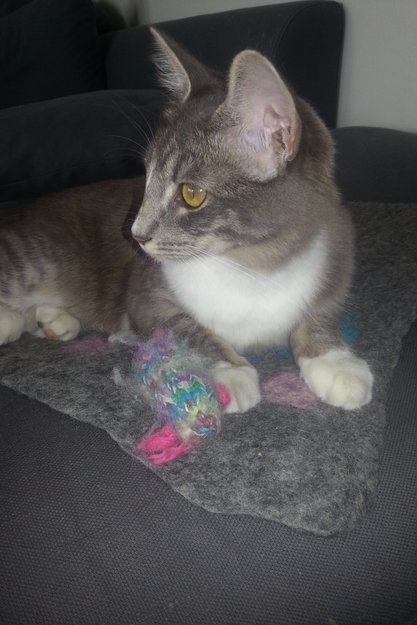 Hun er halvt orientaler og har et litt langt ansikt og store ører. Far er langhåret, så hun har halvlang pels med vakker buskete hale. Hun er grå på ryggen og hvit på brystet, og har en tynn hvit stripe mellom øynene. Hun er en nærvøs liten katt, som er ganske redd for fremmede. Hun er 8mnd gammel