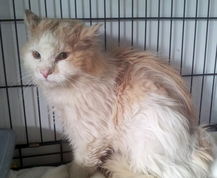Snill og kjælen, men veldig medtatt. Ser ut til å gått ute i lang tid.