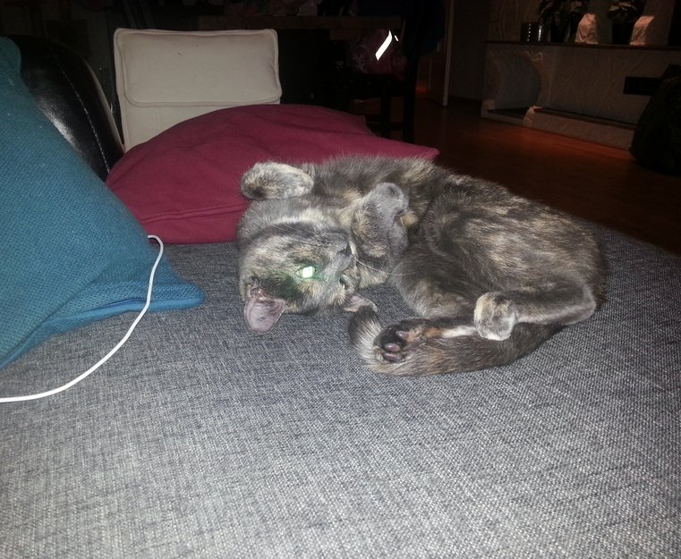 Liten og nett skilpaddefarget jente. Svart snute og svarte værhår. Grønne øyne.