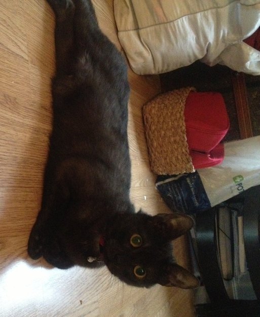Katten løper inn til oss hver gang vi åpner ytterdøren, vi kaster den ut, og det samme skjer neste gang vi åpner døren. Derfor har vi ikke hjerte lenger til å holde den ute. Katten er grå-svart, korthåret, og har et rødt halsbånd. Hun er veldig kosete.