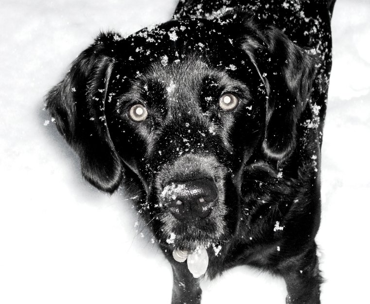 Han er en svart blandingshund som ligner på en ung spenstig labrador. Brune øyne, med en hvit stripe på brystet.