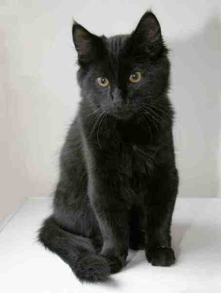 Sort, semilanghåret hannkatt, ca 6-8 mnd gammel, blank i pelsen, i godt hold, tillitsfull og kosete!