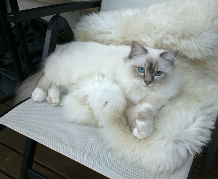 Helling Birma, 9 måneder. Lang, fluffy pels. Hvit, med lysgrå ører og hale. Knallblå øyne. Veldig kosete og uredd. Dypt savnet av både eier og kattesøster.