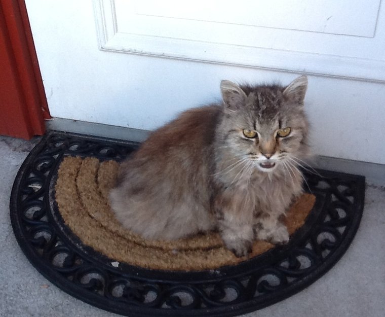 En ekstra tå på hver pote. Stor, langhåret, ser ut som en gaupe i fjeset. Veldig tynn, bare bein og knokler. Mjauer og søker kos og mat. Vil gjerne komme inn, ligger ute på trappa i lange perioder.