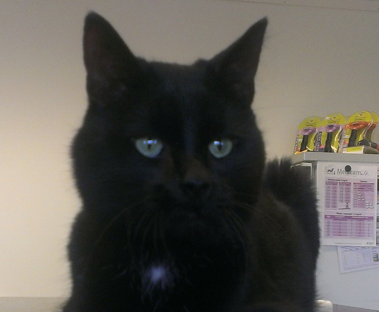 Han går litt rart med bakbena og har en slags knekk på en forlabben, ellers er han en veldig søt og kosete katt :)
