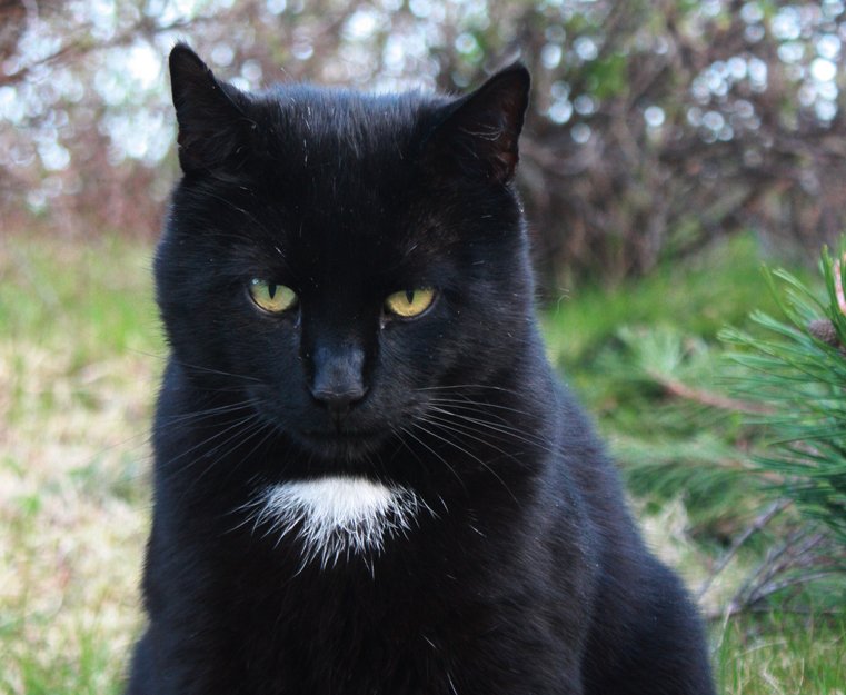 Er helsort med en hvit flekk på bringa og litt hvitt under magen. Kastrert og chipmerket med en M i øret.