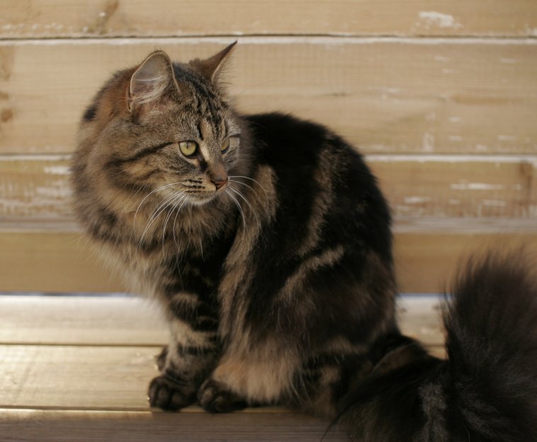 Hun er en voksen men liten hunkatt som er glad i mennesker og kos. Hun er langhåret og har bustete hale. Hun har ID-tatovering i hennes ventre øre og chip i nakken.