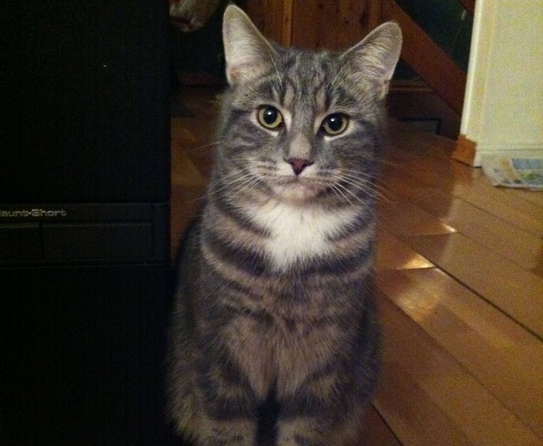 Korthåret grå pels med noen lysegrå striper, litt hvit pels på bakpotene og halsen. 3 år gammel.