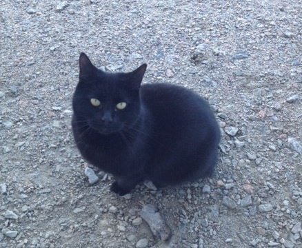 Sort katt, med lite hvitt felt på halsen. Rødt halsbånd med navn og adresse og merket id/chip.