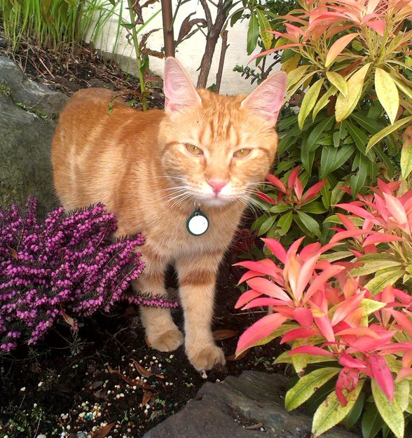 Han er rød/oransje og har veldig symmetriske striper på kropp og i ansikt (M-formasjon i pannen). Tillitsfull og uredd, "svarer" ofte ved tilsnakk, og kan gjerne følge etter deg hvis du klapper den, myk og glatt i pelsen. Han hadde på seg et selvlysende gult reflekshalsbånd med rund id-brikke (grønn/refleks). Han har også micro ID-chip som kan sjekkes av veterinær og politi.