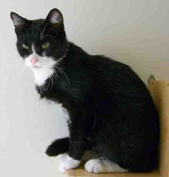 Katten er sort med hvitt neseparti, hvit i brystet, magen og på beina. Nesen er rosa, værhårene over det ene øyet er hvite, over det andre øyet sorte. Hvite hår i ørene.