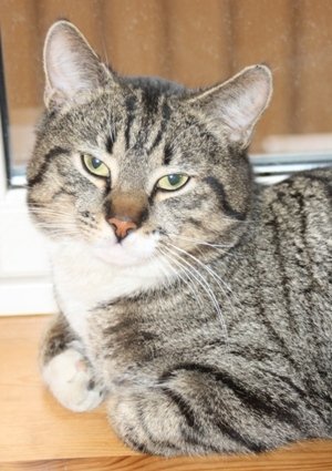 Brun/grå og sort tigret med hvite poter.