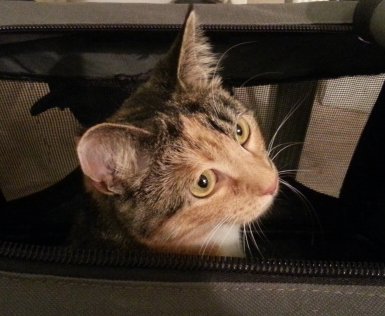 Den søkte tilflukt i en butikk her. Jeg ble tilkalt for å hjelpe til. Var redd og stresset. Fikk den inn i et bur, sjekket hos veterinær, ingen skader. Ikke chip, ikke tatovering, ingen ID, ikke sterilisert !!!