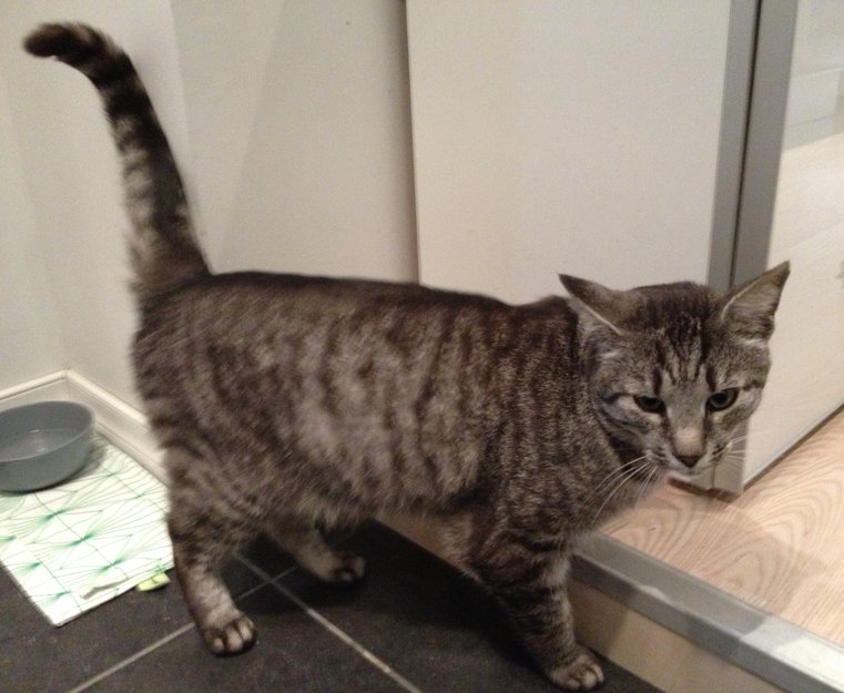 Stor (lang) katt. Tatovert 'id' i øret. Veldig nysgjerrig og aktiv. Spisst ansikt. Hakk i ene øret.