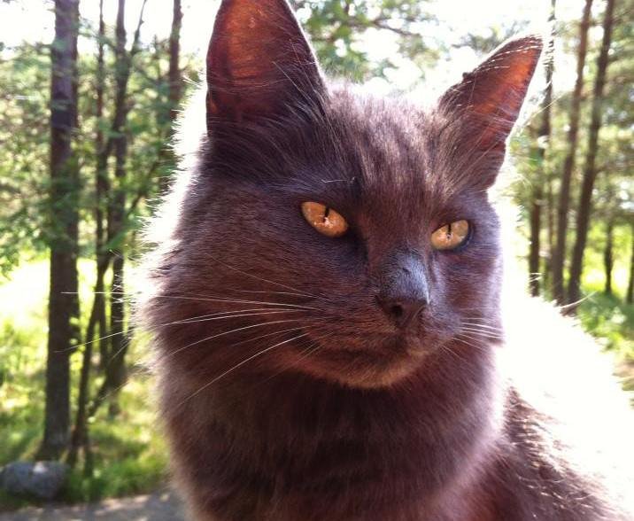 Langhåret grå katt. Liten, kraftige bakben. Gule øyne, lyse poter, lite arr på venstre øre. Kjælen og kosete. "Snakker" mye.