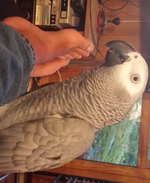 Grå Jaco med rød stjert. Liker å prate. Er tam og veldig kosete.