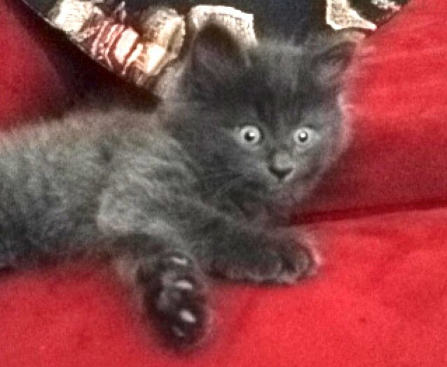 Han er liten kattunge på 8 uker, med runde gule øyne. Han er liten og engstelig og veldig redd hender, men liker å bli klødd bak ørende.