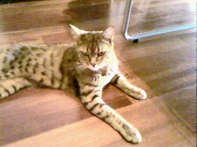 Tigerstripet foran og leopardflekket bak. Ganske liten hunnkatt som er kjælen og vant til folk.