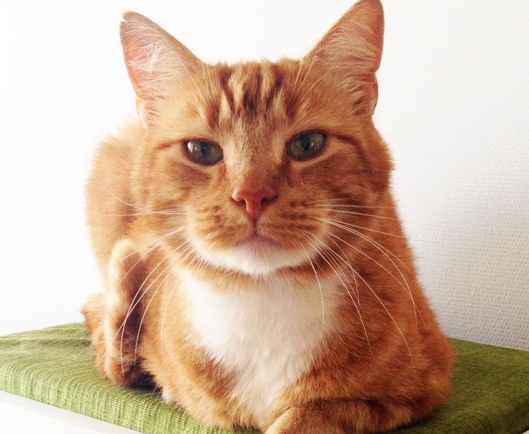 Rød katt med hvite detaljer i ansiktet, på brystet, magen og potene. Spesielt mønster på halen. Hakk i høyre øre og grønne øyne.