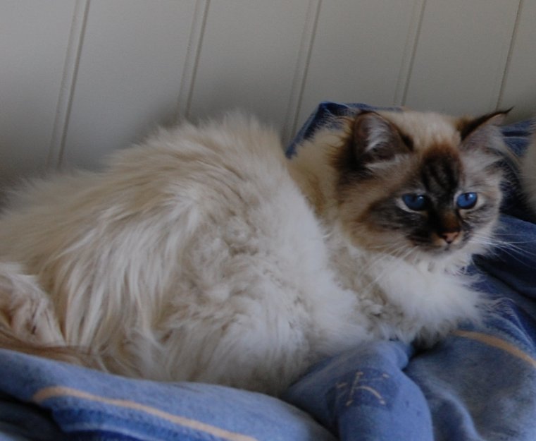 Kroppen og potene er hvite og øynene er blå. Kikki er middels stor; nesten 4 kg.