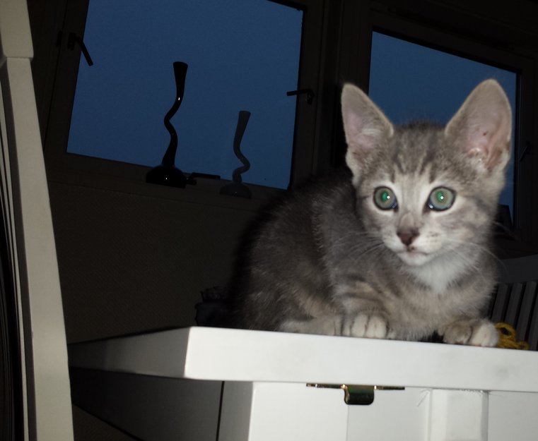 Kattunge. Mjauer mye. Er tam. Vandt med barn of hunder virker det som.
