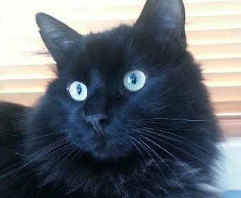Stor, svart, langhåret med liten hvit flekk på halsen.