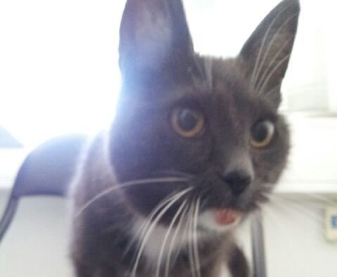 ID merket, men finner allikevel ikke eier. Hvite poter og hvitt bryst ellers grå. Mangler tenner i underkjeven. Mulig gått ute lenge.