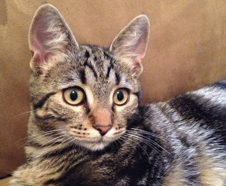 Makrellstripet katt, medium størrelse. Veldig sosial og kosete. Lyder ved navn Sipper eller Sivertsen.