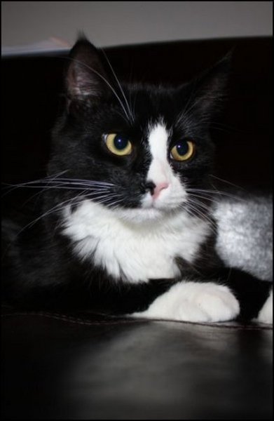 Katten har en svart flekk på nesen. Hvit på hals, bryst og mage. Hvite sokker , har en svart flekk på høyre bakfot.