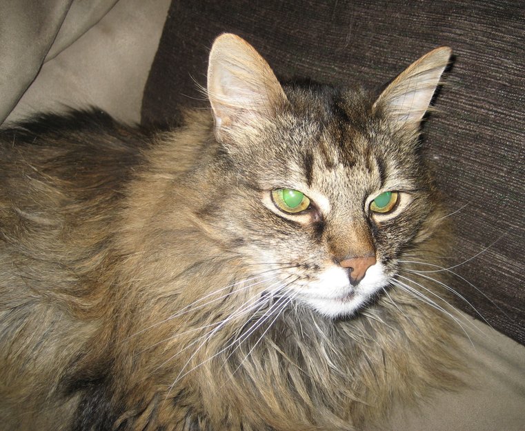 Grønne øyne med en flekk i, sort stripe langs ryggen.