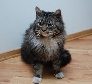 Langhåret, forsiktig,men snill ukastrert hannkatt. Sort rygg, grå og brun underpels, hvite poter og hvitt under haka, hvitt på brystet. Grønne øyne og mørk rosa snute. Tynn og skitten med flere sår på kroppen og mange floker og klumper i pelsen. Venstre øye er svært betent. Virker veldig sliten og glad for å endelig komme innendørs.