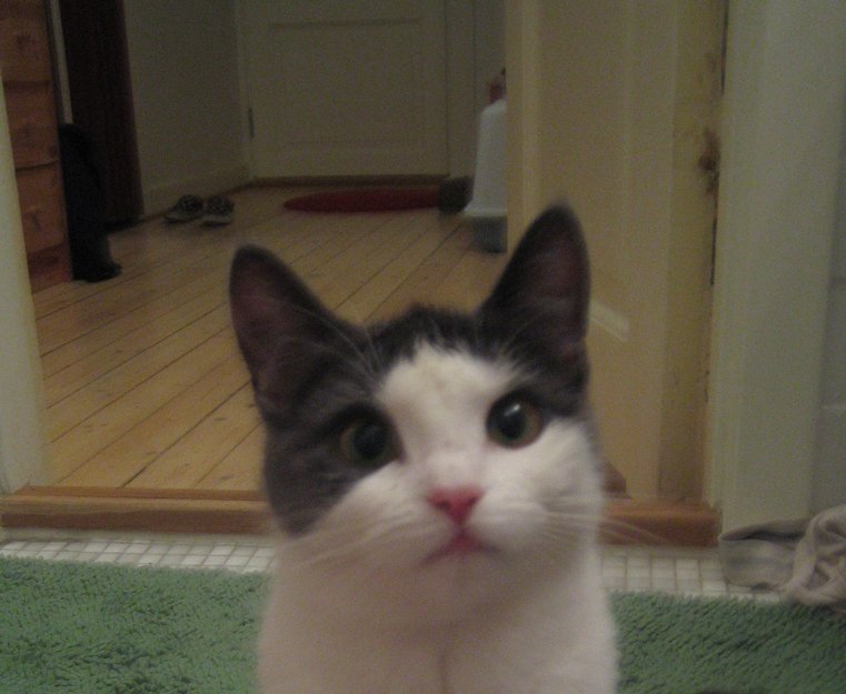 Mørk grå og hvit med grønne øyne. Lyder til navnet sitt og kan være både veldig kosete og veldig redd