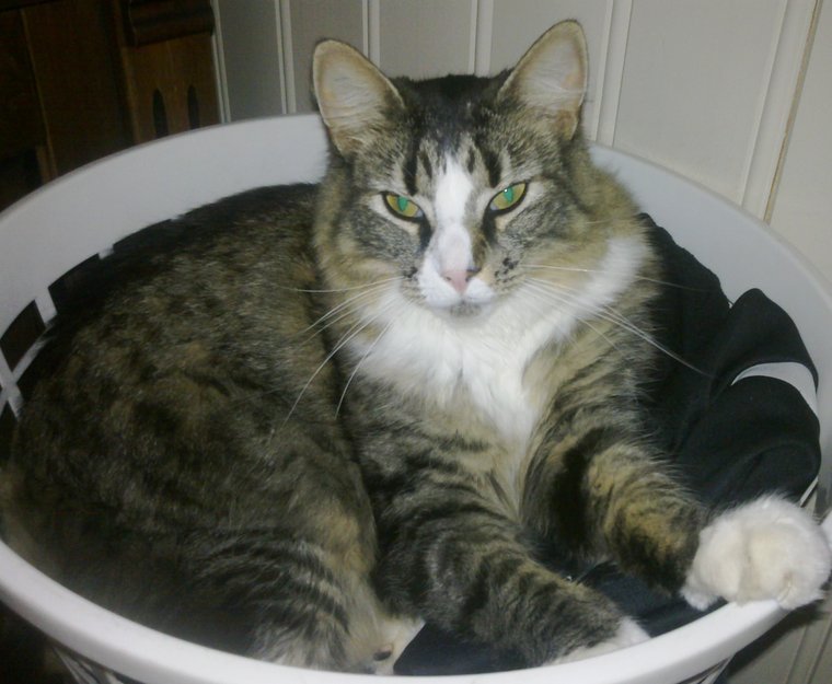 hvite poter, hvitt bryst, pen katt med fluffy pels og stor buskete hale. Den er 7 år.