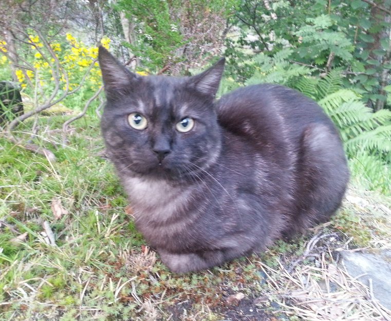 Katten dukket opp ca juni 2013. Tynn og hadde vært ute alene en stund så det ut til. Har fått jevnlig mat og ser bedre ut nå.