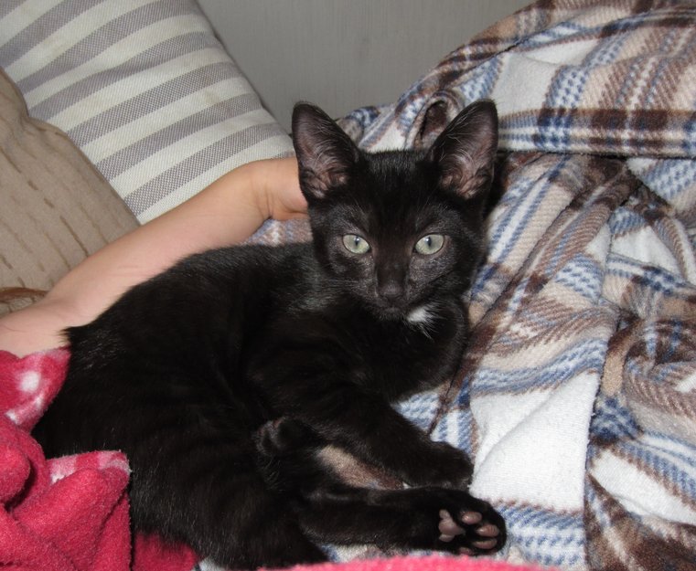 10 mnd. gammel svart katt med hvit flekk på halsen og nederst på magen.