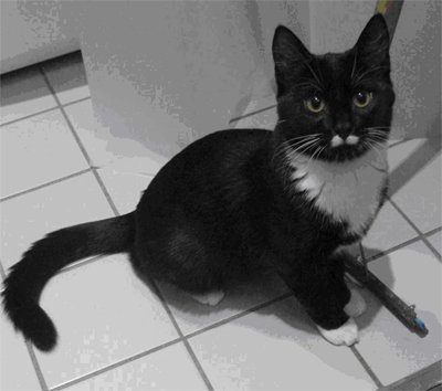 1 år gammel hunnkatt, svart med hvite poter, hvit foran på brystet og på magen og hvite flekker under snuten. Lang og smal kropp. Er ikke merket.